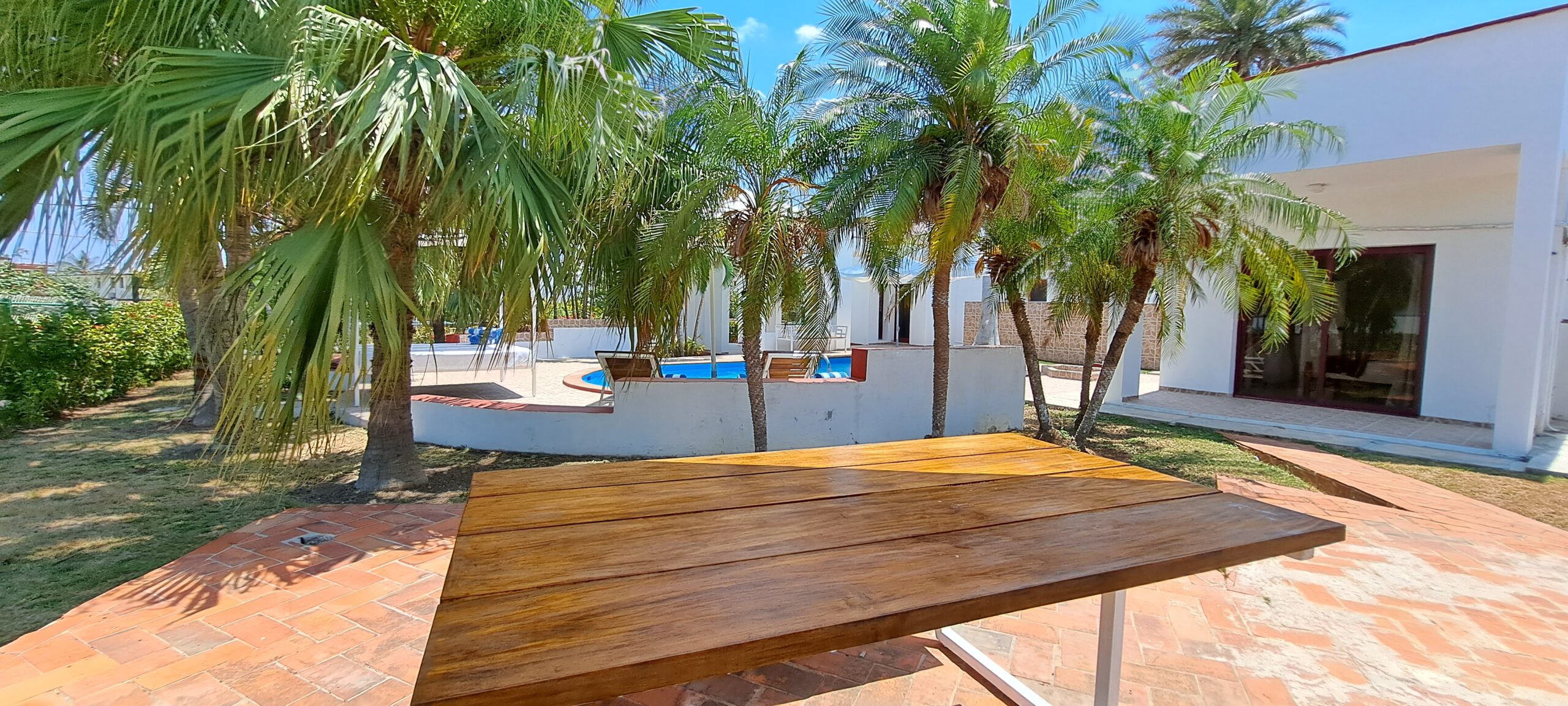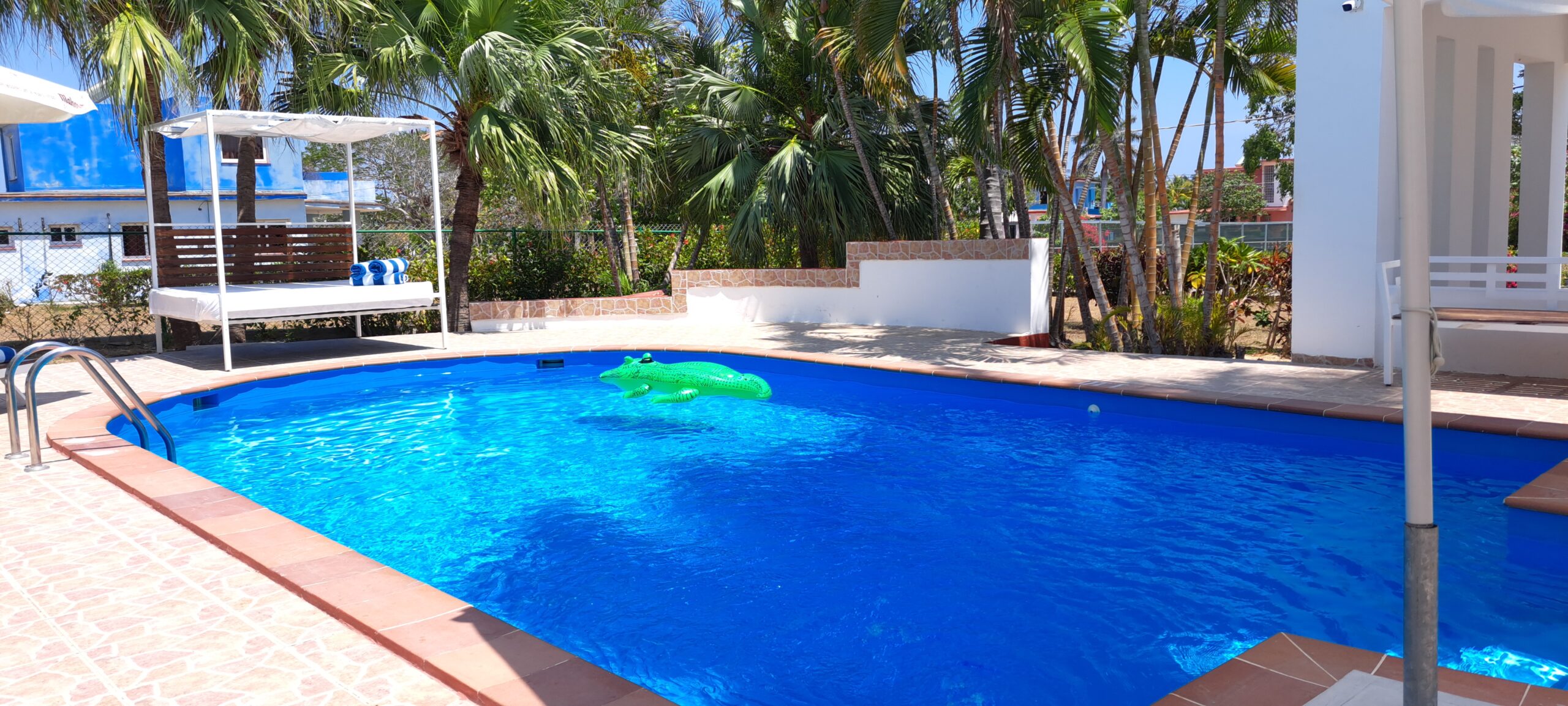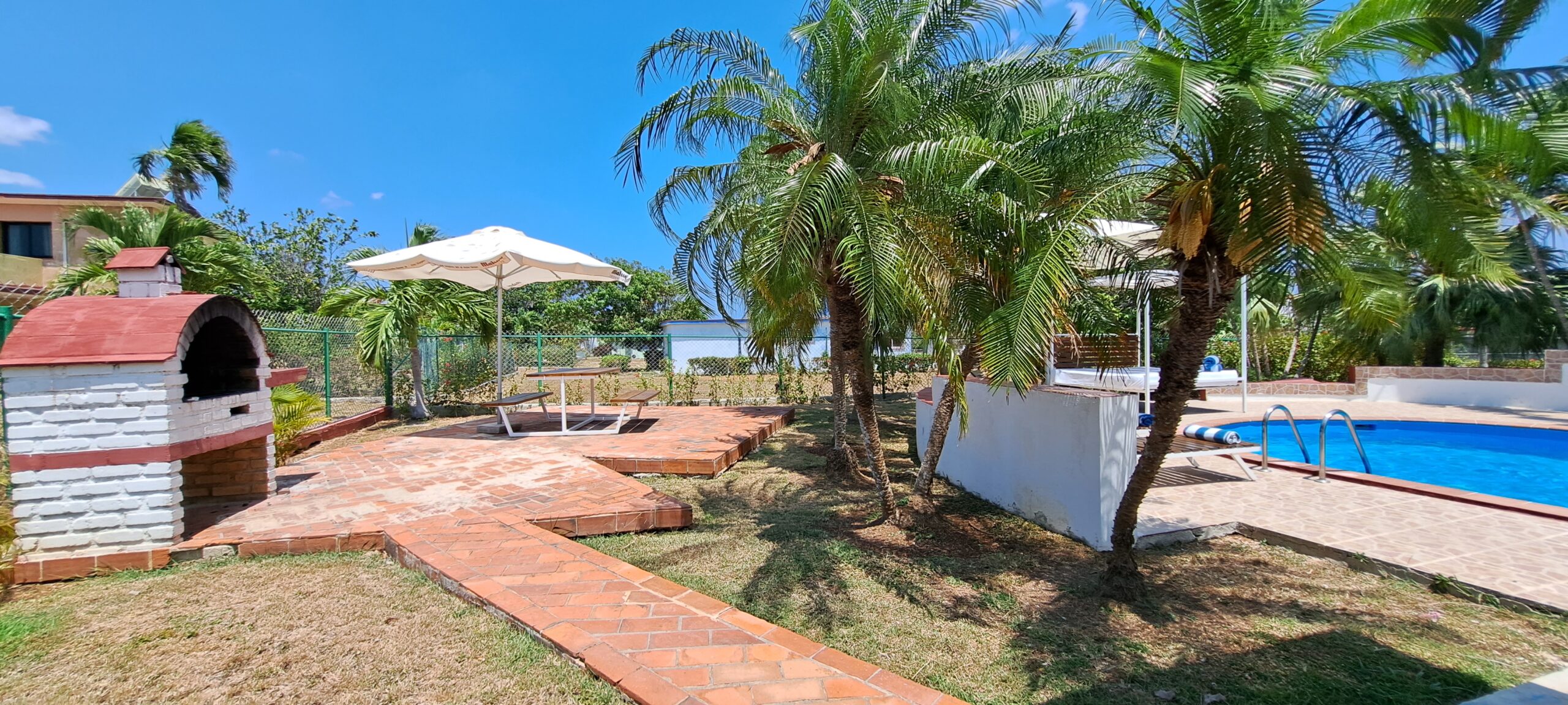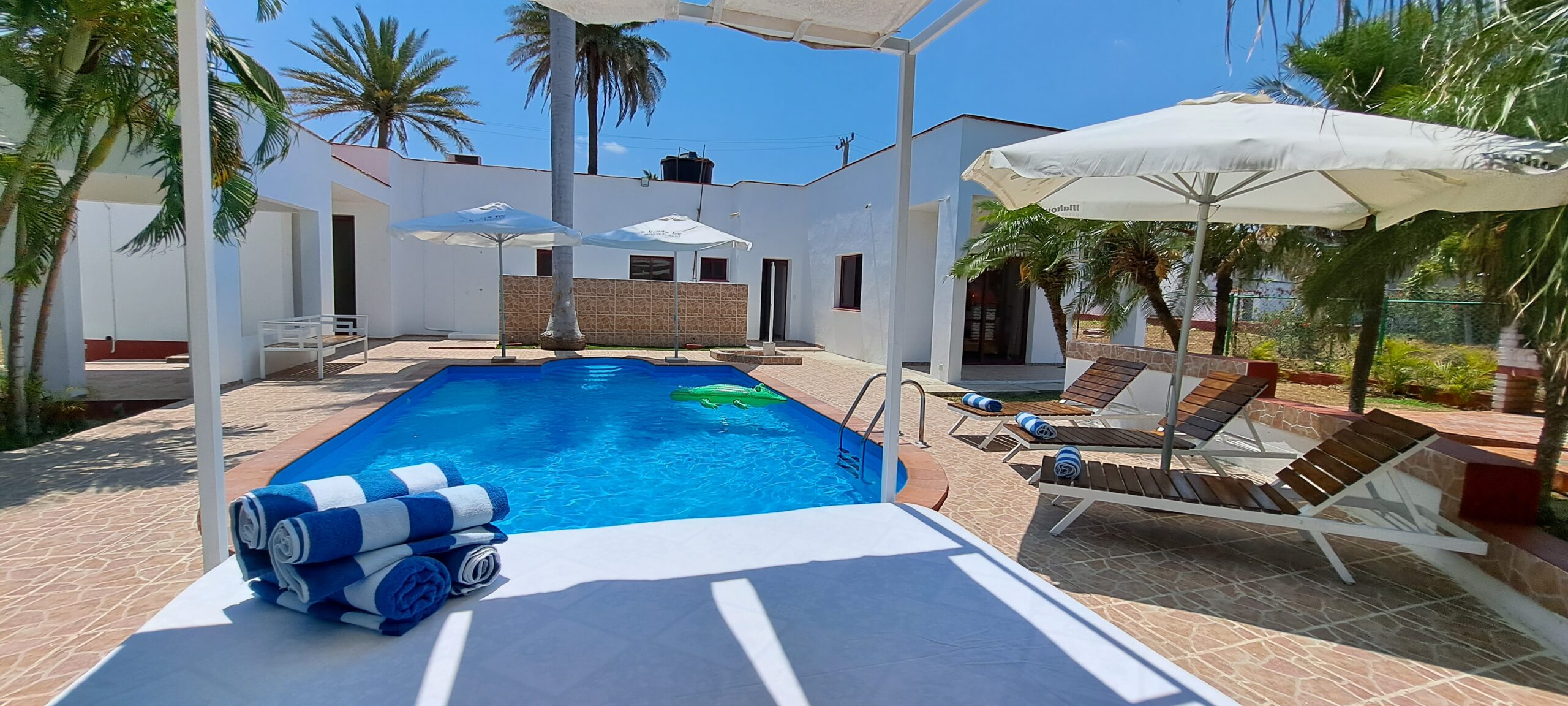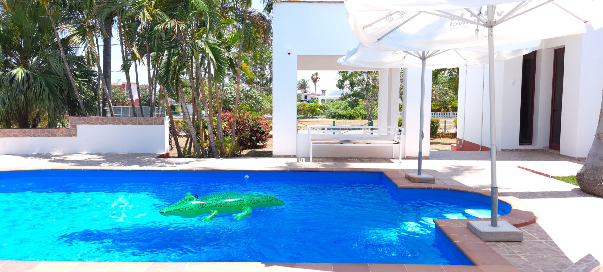 La propiedad, tiene capacidad hasta 7 personas, con alojamiento en 3 habitaciones: dos dobles y 1 triple, con amplios espacios y confort. Cada habitación con baño en suite.En esta Villa, ademas de la cercanía a la playa, tiene piscina propia, con tumbonas y cama balinesa, baño exterior en la piscina.Garaje carpoch para 2 autos.ámaras de seguridad en todo el perímetro de la casa.Disponible lencería blanca para las habitaciones y toallas de piscina.Cocina completamente equipada para uso de los huéspedes: olla reina arrocera, cafetera eléctrica expreso, batidora, microwave, cocina de gas de balón, refrigerador, nevera, freidora eléctrica, utensilios de cocina.En el área de la piscina dispone de horno BBQ, comedor al aire libre, cama balinesa y tumbonas.TV por cable en el salón y climatización en toda la casa con AC tipo split.