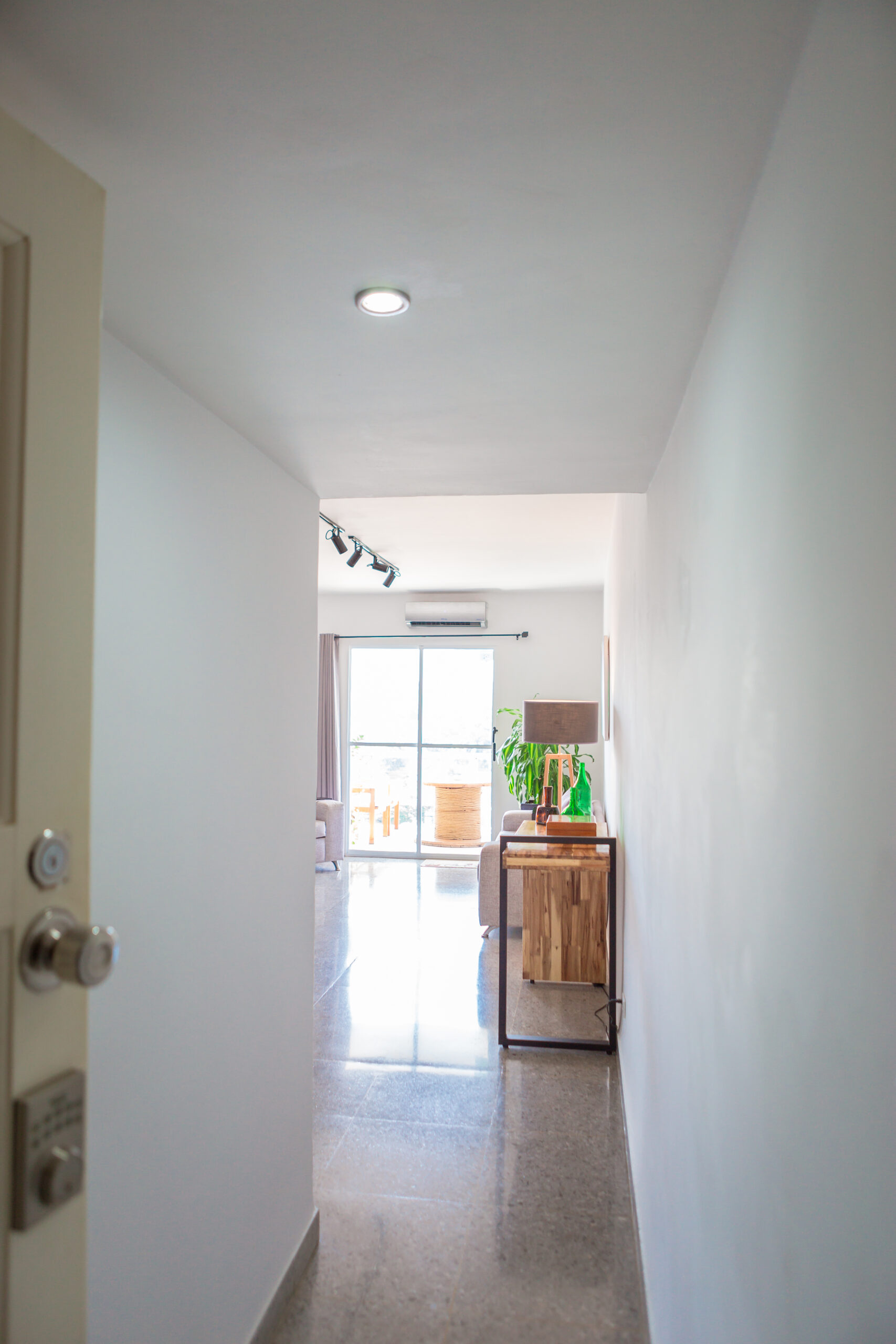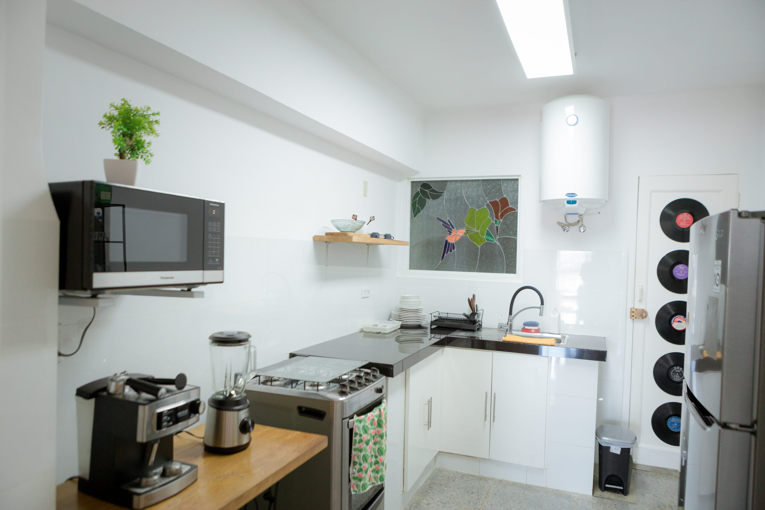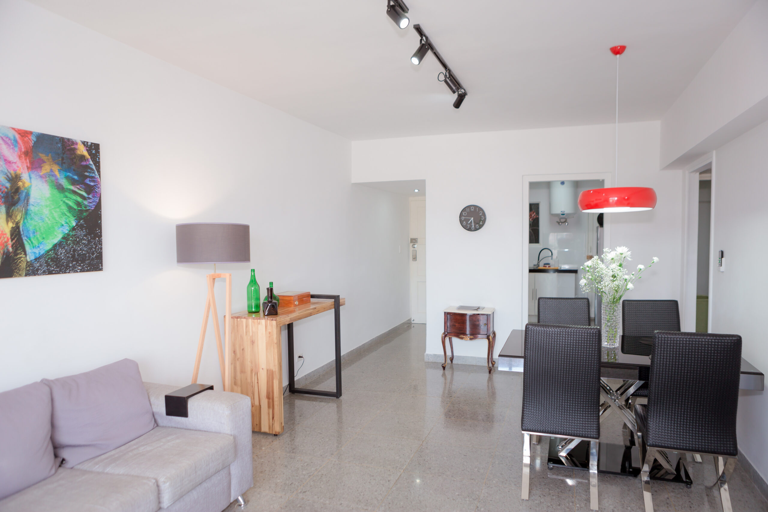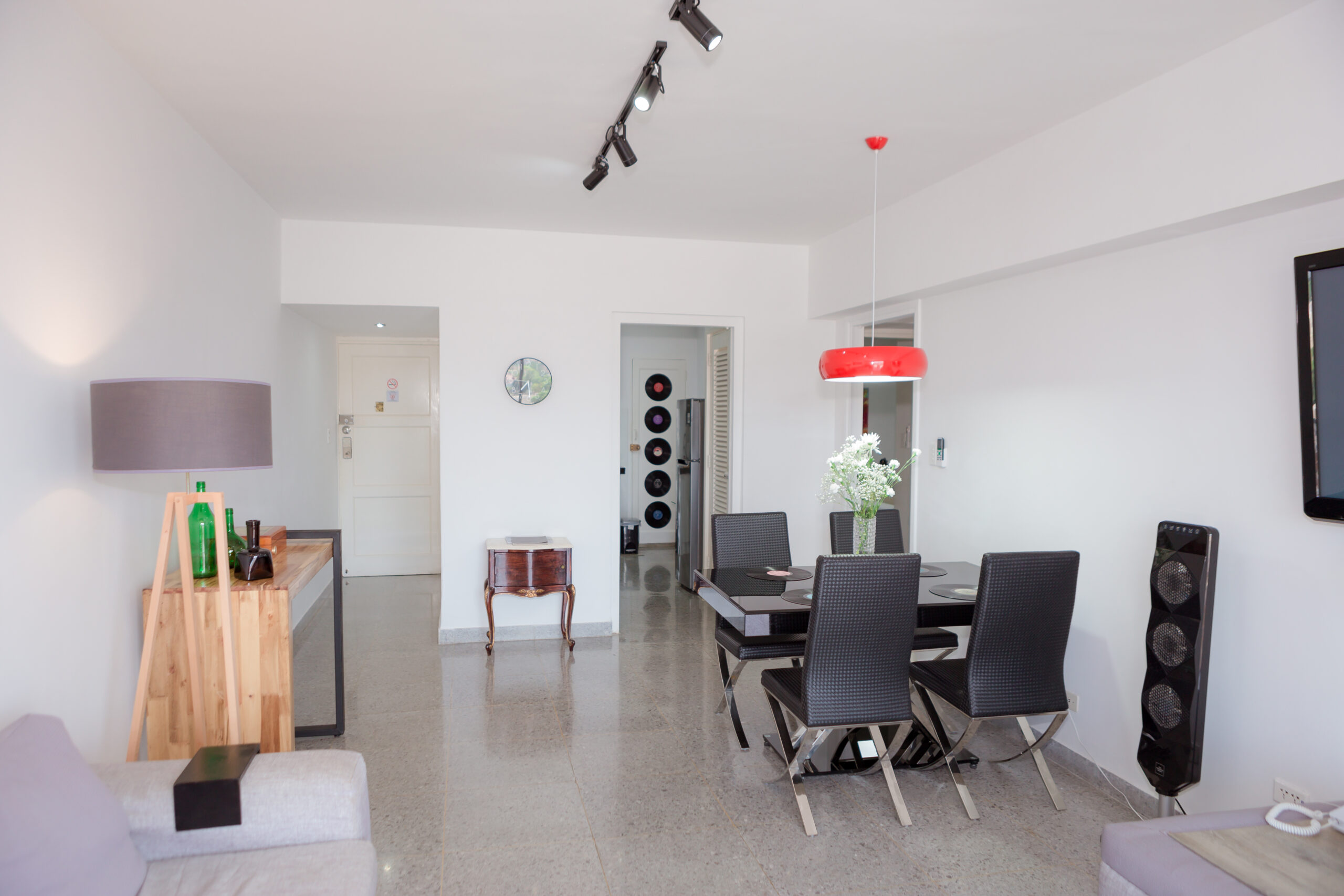 Cortinas blackout.Escritorio de trabajo con una comoda silla. Aire acondicionado de nueva generación, tipo Split. En cada habitación y en el salón, de modo que se climatiza todo el espacio del apartamento. Baño privado en cada habitación. Agua caliente y presurizada, secador de pelo. En los baños dispone de papel higiénico y jabón.La sala comedor es un espacio amplio y acogedor donde puede ver televisión, HDTV 52”, compartir con familiares y amigos, o disfrutar de un buen desayuno. Todo el mobiliario es nuevo y confortable. Cocina, con sus implementos y accesorios, Microwave, utensilios, cocina con horno, Refrigerador, cafetera, licuadora y batidora. Vajilla y cubiertos.
